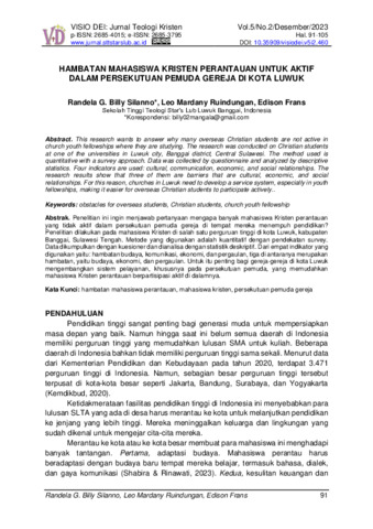 Randela, G. Billy Silanno and Leo, Mardany Ruindungan and Edison, Frans (2023) Hambatan mahasiswa Kristen perantauan untuk aktif dalam persekutuan pemuda gereja di Kota Luwuk. Visio Dei: Jurnal Teologi Kristen, 5 (2): 3. pp. 91-105. ISSN 2685-4015