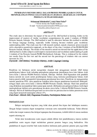 Muhammad, Misbahuddin and Andy, Fahmi Halim (2022) Penerapan metode drill dalam proses pembelajaran untuk meningkatkan penguasaan kosakata bahasa Arab kelas 2 SD PKBM Permata Sunnah Sidoarjo. Jurnal Al-Fawa’id : Jurnal Agama dan Bahasa, 12 (2): 7. pp. 257-266. ISSN 2774-3748