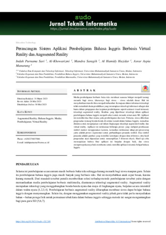 Indah, Purnama Sari and Al-Khowarizmi, Al-Khowarizmi and Mandra, Saragih and Al Hamidy, Hazidar and Asrar, Aspia Manurung (2023) Perancangan sistem aplikasi pembelajaran bahasa Inggris berbasis virtual reality dan augmented reality. Sudo Jurnal Teknik Informatika, 2 (2): 3. pp. 61-67. ISSN 2829-7342
