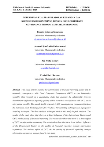 Riyanto, Setiawan Suharsono and Achmad, Syahfrudin Zulkarnnaeni and Ayu, Widia Lestari and Pratiwi, Dwi Libriana (2023) Determinan kualitas pelaporan keuangan dan konsekuensi ekonominya dengan good corporate governance sebagai variabel intervening. Jurnal Ilmiah Akuntansi Indonesia (JIAI), 8 (2): 3. pp. 184-207. ISSN 2528-6501