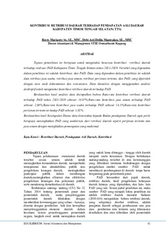 Resty, Marianty Se and Debi, Asti Delila Mauwalan (2022) Kontribusi retribusi daerah terhadap pendapatan asli daerah Kabupaten Timor Tengah Selatan (TTS). Equilibrium: Jurnal Akuntansi dan Manajemen, 10 (-): 5. pp. 42-58. ISSN 2620-3790
