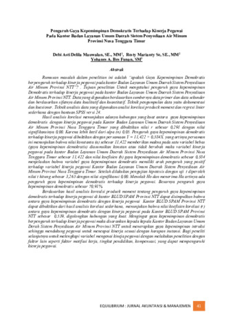 Debi, Asti Delila Mauwalan and Resty, Marianty Se and Yohanes, A. Bes Funan (2023) Pengaruh gaya kepemimpinan demokratis terhadap kinerja pegawai pada Kantor Badan Layanan Umum Daerah Sistem Penyediaan Air Minum Provinsi Nusa Tenggara Timur. Equilibrium: Jurnal Akuntansi dan Manajemen, 11 (-): 5. pp. 41-63. ISSN 2620-3790