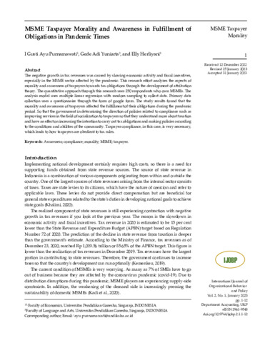 I, Gusti Ayu Purnamawati and Gede, Adi Yuniarta and Elly, Herliyani (2023) MSME taxpayer morality and awareness in fulfillment of obligations in pandemic times. International Journal of Organizational Behavior and Policy, 2 (1): 1. pp. 1-12. ISSN 2961-9548