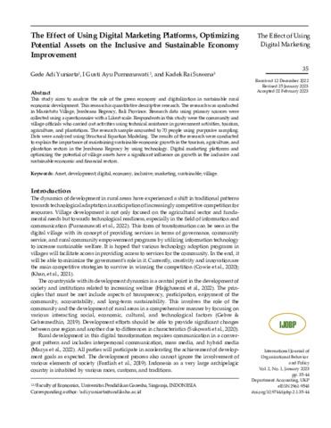 Gede, Adi Yuniarta and I, Gusti Ayu Purnamawati and Kadek, Rai Suwena (2023) The effect of using digital marketing platforms, optimizing potential assets on the inclusive and sustainable economy improvement. International Journal of Organizational Behavior and Policy, 2 (1): 4. pp. 35-44. ISSN 2961-9548