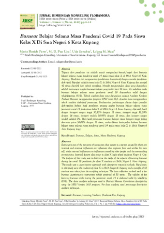 Maria, Florida Pawe and M., D. Pua Upa and Uda, Geradus and Lolang, M. Masi (2023) Burnout belajar selama masa pandemi Covid 19 pada siswa kelas X Di SMA Negeri 6 Kota Kupang. Jurnal Bimbingan Konseling Flobamora, 1 (1): 2. pp. 9-16. ISSN 2986-9234