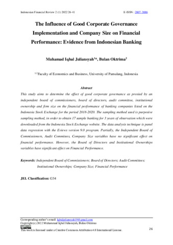 Muhamad, Iqbal Juliansyah and Bulan, Oktrima (2022) The influence of good corporate governance implementation and company size on financial performance: evidence from Indonesian Banking. Indonesia Financial Review, 2 (1): 3. pp. 26-41. ISSN 2807-3886