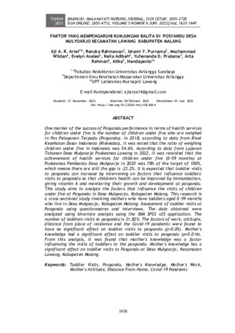 Aji, A. R. Arief and Rendra, Rahmawan and Ishami, Y. Purnama and Mochammad, Wildan and Evelyn, Asaleo and Naila, Adibah and Yuhenanda, D. Pratama and Arta, Rahman and Atika, Atika and Handayanto, Handayanto (2023) Faktor yang mempengaruhi kunjungan Balita di Posyandu Desa Mulyoarjo Kecamatan Lawang Kabupaten Malang. Manuju: Malahayati Nursing Journal, 5 (6): 2. pp. 1635-1649. ISSN 2655-2728