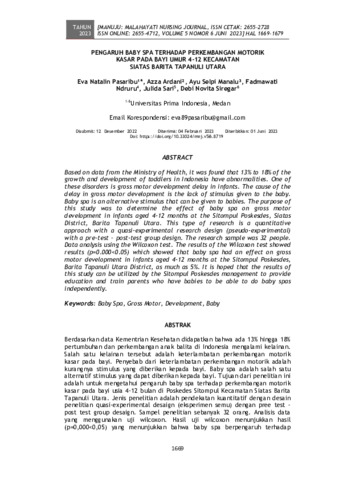 Eva, Natalin Pasaribu and Azza, Ardani and Ayu, Selpi Manalu and Fadmawati, Ndruru and Julida, Sari and Debi, Novita Siregar (2023) Pengaruh baby spa terhadap perkembangan motorik kasar pada bayi umur 4-12 Kecamatan Siatas Barita Tapanuli Utara. Manuju: Malahayati Nursing Journal, 5 (6): 6. pp. 1669-1679. ISSN 2655-2728