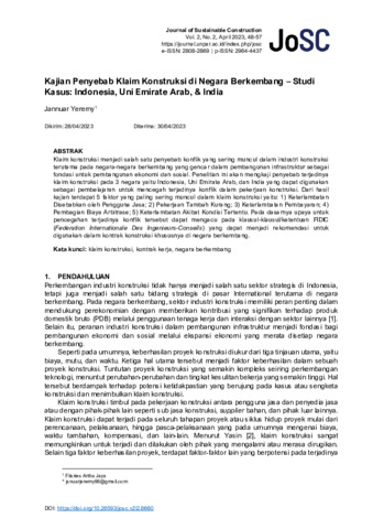 Jannuar, Yeremy (2023) Kajian penyebab klaim konstruksi di negara berkembang – studi kasus: Indonesia, Uni Emirate Arab, & India. Journal of Sustainable Construction, 2 (2): 5. pp. 48-57. ISSN 2964-4437