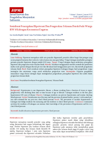 Lia, Awalia Majida and Sarni, Sarni and Inna, Nur Rahma Fajrin and Ismi, Elya Wirdati (2022) Sosialisasi pencegahan hipertensi dan pengecekan tekanan darah pada warga RW 8 Kalongan Kecamatan Ungaran. Jurnal Inovasi dan Pengabdian Masyarakat Indonesia, 1 (1): 1. pp. 1-3. ISSN 2829-5617
