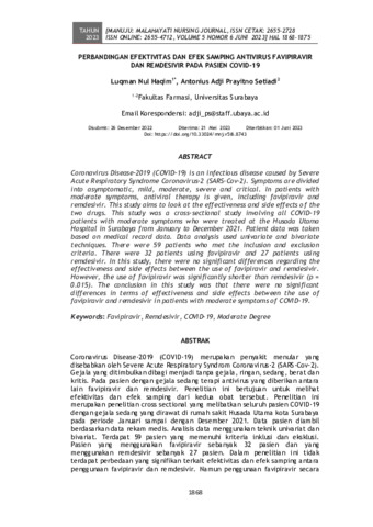 Luqman, Nul Haqim and Antonius, Adji Prayitno Setiadi (2023) Perbandingan efektivitas dan efek samping antivirus favipiravir dan remdesivir pada pasien Covid-19. Manuju: Malahayati Nursing Journal, 5 (6): 23. pp. 1868-1875. ISSN 2655-2728