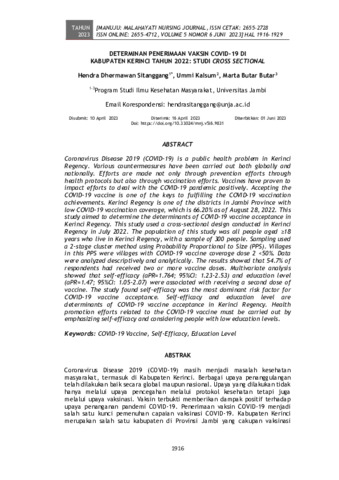 Hendra, Dhermawan Sitanggang and Ummi, Kalsum and Marta, Butar Butar (2023) Determinan penerimaan vaksin Covid-19 di Kabupaten Kerinci tahun 2022: Studi cross sectional. Manuju: Malahayati Nursing Journal, 5 (6): 26. pp. 1916-1929. ISSN 2655-2728