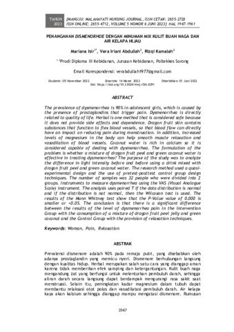 Mariana, Isir and Vera, Iriani Abdullah and Rizqi, Kamalah (2023) Penanganan dismenorhoe dengan minuman mix kulit buah naga dan air kelapa hijau. Manuju: Malahayati Nursing Journal, 5 (6): 29. pp. 1947-1961. ISSN 2655-2728