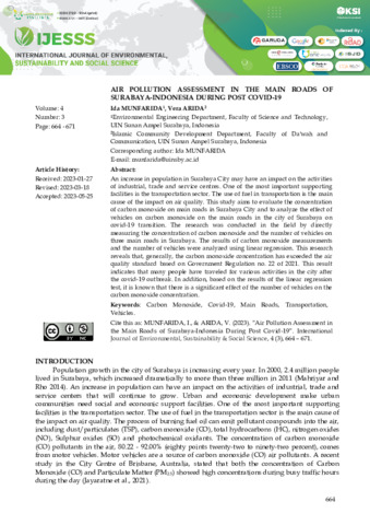 Ida, Munfarida and Vera, Arida (2023) Air pollution assessment in the main roads of Surabaya-Indonesia during post Covid-19. International Journal of Environmental, Sustainability and Social Science, 4 (3): 4. pp. 664-671. ISSN 2720-9644