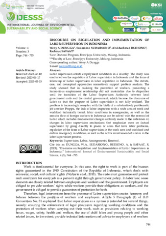 Weny, A Dungga and Sudarsono, Sudarsono and Abd, Rachmad Budiono and Rachmat, Safaat (2023) Discourse on regulation and implementation of labor supervision in Indonesia. International Journal of Environmental, Sustainability and Social Science, 4 (3): 11. pp. 744-755. ISSN 2720-9644