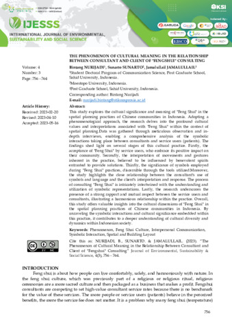 Bintang, Nurijadi and Sunarto, Sunarto and Jamalullail, Jamalullail (2023) The phenomenon of cultural meaning in the relationship between consultant and client of "Fengshui" consulting. International Journal of Environmental, Sustainability and Social Science, 4 (3): 12. pp. 756-764. ISSN 2720-9644