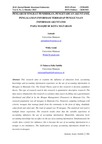 Animah, Animah and Widia, Astuti and D Tialurra, Della Nabilla (2023) Pengaruh tingkat pendidikan, pengetahuan akuntansi, pengalaman informasi terhadap penggunaan informasi akuntansi pada masjid se Kota Mataram. Jurnal Ilmiah Akuntansi Indonesia (JIAI), 8 (2): 7. pp. 284-303. ISSN 2528-6501