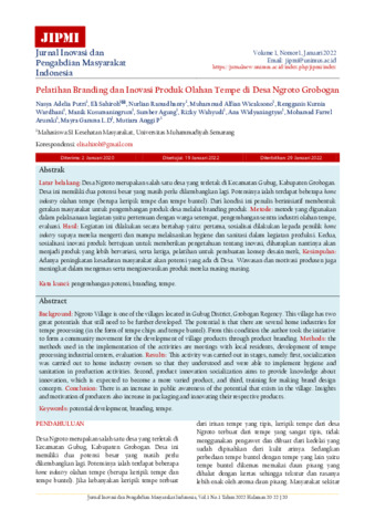 Nasya, Adelia Putri and Eli, Sahiroh and Nurlian, Ramadhanty and Muhammad, Alfian Wicaksono and Rengganis, Kurnia Wardhani and Manik, Kusumaningrum and Sumber, Agung and Rizky, Wahyudi and Ana, Widyaningtyas and Mohamad, Farrel Arumki and Mayra, Gamma L.D and Mutiara, Anggi (2022) Pelatihan branding dan inovasi produk olahan tempe di Desa Ngroto Grobogan. Jurnal Inovasi dan Pengabdian Masyarakat Indonesia, 1 (1): 6. pp. 20-22. ISSN 2829-5617