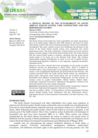 Shenaaz, Gani (2023) A critical review of the sustainability of South Africa's health system, user satisfaction and key performance scores. International Journal of Environmental, Sustainability and Social Science, 4 (3): 29. pp. 927-942. ISSN 2720-9644