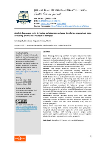 Fara, Zaqiah and Dien, Gusta Anggraini Nursal and Aladin, Aladin (2023) Analisis kepuasan catin terhadap pelaksanaan edukasi kesehatan reproduksi pada konseling pranikah di Puskesmas Lampasi. Jurnal Ilmu Kesehatan Bhakti Husada: Health Science Journal, 14 (1): 3. pp. 15-24. ISSN 2252-9462