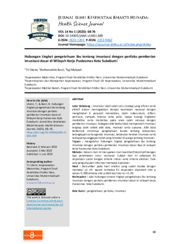 Tri, Utami and Burhanuddin, Basri and Egi, Mulyadi (2023) Hubungan tingkat pengetahuan ibu tentang imunisasi dengan perilaku pemberian imunisasi dasar di Wilayah Kerja Puskesmas Kota Sukabumi. Jurnal Ilmu Kesehatan Bhakti Husada: Health Science Journal, 14 (1): 9. pp. 68-76. ISSN 2252-9462