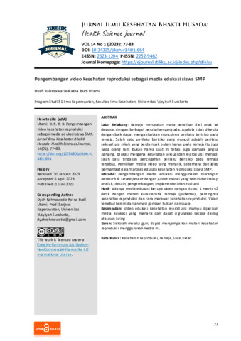 Dyah, Rahmawatie Ratna Budi Utami (2023) Pengembangan video kesehatan reproduksi sebagai media edukasi siswa SMP. Jurnal Ilmu Kesehatan Bhakti Husada: Health Science Journal, 14 (1): 10. pp. 77-83. ISSN 2252-9462