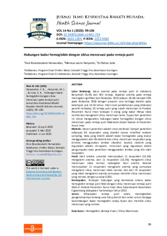 Fera, Riswidautami Herwandar and Merissa, Laora Heryanto and Sri, Ratna Juita (2023) Hubungan kadar hemoglobin dengan siklus mensruasi pada remaja putri. Jurnal Ilmu Kesehatan Bhakti Husada: Health Science Journal, 14 (1): 13. pp. 99-106. ISSN 2252-9462