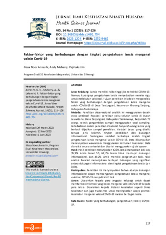 Nissa, Noor Annashr and Andy, Muharry and Puji, Laksmini (2023) Faktor-faktor yang berhubungan dengan tingkat pengetahuan lansia mengenai vaksin Covid-19. Jurnal Ilmu Kesehatan Bhakti Husada: Health Science Journal, 14 (1): 15. pp. 117-126. ISSN 2252-9462