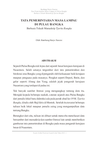 Bambang, Haryo Suseno (2022) Tata pemerintahan masa lampau di pulau Bangka: Berbasis telaah manuskrip Tjarita Bangka. Kapita Selekta Penulisan Sejarah Lokal, 5 (-): 1. pp. 1-98. ISSN 2986-0830