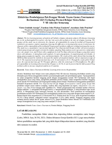 Victor, Jendade Araujo and Yustinus, Joko Wahyu Yuniarto and Anselmus, Joko Prayitno (2023) Efektivitas pembelajaran pak dengan metode teams games tournament berbantuan LKS terhadap prestasi belajar siswa kelas V SD Aloysius Semarang. Jurnal Filsafat dan Teologi Katolik, 7 (1): 5. pp. 73-79. ISSN 2614-5898