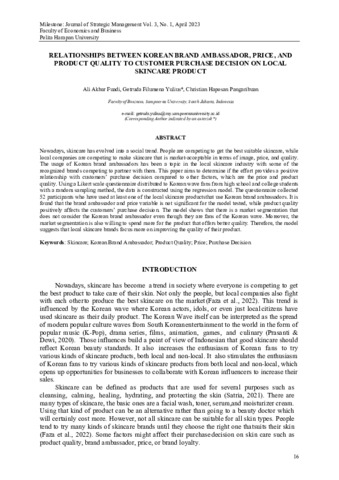 Ali, Akbar Fuadi and Getruda, Filumena Yulius and Christian, Haposan Pangaribuan (2023) Relationships between Korean brand ambassador, price, and product quality to customer purchase decision on local skincare product. Milestone: Journal of Strategic Management, 2 (1): 2. pp. 16-31. ISSN 2775-3565