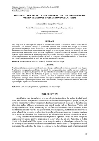 Muhammad, Ivan Syaugy and Dewi, Wuisan (2023) The impact of celebrity endorsement on consumer behavior within the Shopee online shopping platform. Milestone: Journal of Strategic Management, 3 (1): 3. pp. 32-40. ISSN 2775-3565