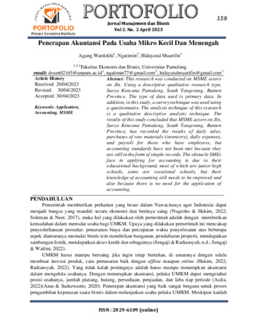 Agung, Wardokhi and Ngatimin, Ngatimin and Hidayatul, Muarifin (2023) Penerapan akuntansi pada usaha mikro kecil dan menengah. Jurnal Portofolio: Jurnal Manajemen dan Bisnis, 2 (2): 6. pp. 159-167. ISSN 2829-6109