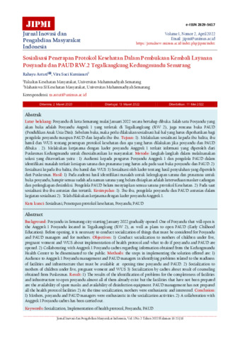 Rahayu, Astuti and Vira, Suci Kurniasari (2022) Sosialisasi penerapan protokol kesehatan dalam pembukaan kembali layanan Posyandu dan PAUD RW.2 Tegalkangkung Kedungmundu Semarang. Jurnal Inovasi dan Pengabdian Masyarakat Indonesia, 1 (2): 5. pp. 18-23. ISSN 2829-5617
