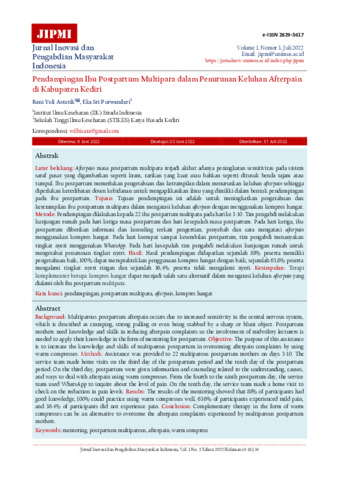 | Uncontrolled Keywords: | Pendampingan, Kompres hangat, Health services, Postpartum multipara, Afterpain, Warm compress |