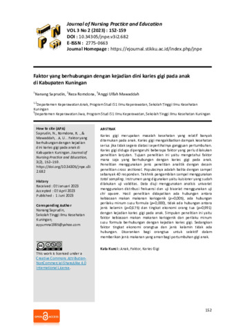 Nanang, Saprudin and Reza, Romdona and Anggi, Ulfah Mawaddah (2023) Faktor yang berhubungan dengan kejadian dini karies gigi pada anak di Kabupaten Kuningan. Journal of Nursing Practice and Education, 3 (2): 7. pp. 152-159. ISSN 2775-0663