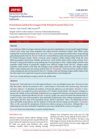 Yuntriyo, Yuntriyo and Tulus, Ariyadi and Didik, Sumanto (2022) Pemeriksaan infeksi kecacingan pada pekerja pemetik daun teh. Jurnal Inovasi dan Pengabdian Masyarakat Indonesia, 1 (3): 9. pp. 35-37. ISSN 2829-5617
