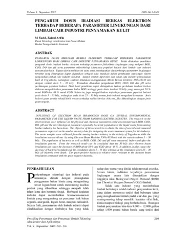PENGARUH DOSIS IRRADIASI BERKAS ELEKTRON TERHADAP BEBERAPA PARAMETER LINGKUNGAN DARI LIMBAH CAIR INDUSTRI PENYAMAKAN KULIT. Telah dilakukan penelitian