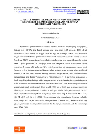 Inria, Chandra and Hasan, Mihardja (2023) Literatur riview: Terapi akupresur pada hiperemesis gravidarum dalam menurunkan lama perawatan di rumah sakit pada era JKN. Journal of Midwifery Care, 3 (2): 1. pp. 126-135. ISSN 2774-4167