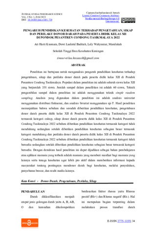 Ari, Harri Kusmara, and Dewi, Laelatul Badriah and Lely, Wahyuniar and Mamlukah, Mamlukah (2023) Pengaruh pendidikan kesehatan terhadap pengetahuan, sikap dan perilaku donor darah pada peserta didik kelas XII di Pondok Pesantren Condong Tasikmalaya 2022. Journal of Health Research Science, 3 (1): 4. pp. 34-43. ISSN 2798-7442