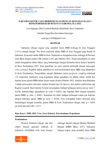 Uus, Supangat and Dewi, Laelatul Badriah and Mamlukah, Mamlukah and Rossi, Suparman (2023) Faktor-faktor yang berhubungan dengan kematian kasus demam berdarah di Kota Tasikmalaya 2022. Journal of Health Research Science, 3 (1): 7. pp. 63-71. ISSN 2798-7442