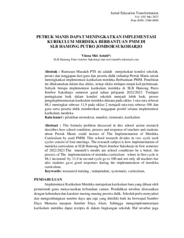 Vinna, Mei Astuti (2023) Petruk manis dapat meningkatkan implementasi kurikulum merdeka berbantuan PMM di SLB Hamong Putro Jombor Sukoharjo. Jurnal Education Transformation, 1 (1): 1. ISSN 2986-8890