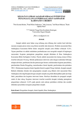Fitri, Kurnia Rahim and Fuad, Hilmi Sudasman and Ade, Listyana and Arif, Ryan Hidayat and Dyah, Ophilia Putri (2023) Kegiatan gerak sajadah sebagai intervensi penanggulangan permasalahan sampah di Kabupaten Cirebon. Jurnal Pemberdayaan dan Pendidikan Kesehatan, 2 (2): 4. pp. 76-87. ISSN 2809-4646