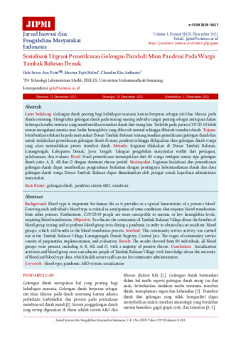 Latar belakang: Golongan darah penting bagi kehidupan manusia karena berperan sebagai ciri khas khusus pada darah seseorang. Mengetahui golongan darah pada masing-masing individu sangat penting sebagai antisipasi dalam beberapa kondisi tertentu yang membutuhkan transfusi darah dari orang lain. Terlebih pada pasien COVID-19 lebih rentan mengalami anemia atau kadar hemoglobin yang dibawah normal sehingga dibutuh transfusi darah. Tujuan: Memberikan edukasi kepada masyarakat Dusun Tambak Bulusan tentang manfaat pemeriksaan golongan darah dan untuk melakukan pemeriksaan golongan darah di masa pandemi sehingga didapatkan data golongan darah warga yang akan memudahkan proses transfusi darah. Metode: Kegiatan dilakukan di Dusun Tambak Bulusan, Karangtengah, Kabupaten Demak, Jawa Tengah. Tahapan pengabdian masyarakat terdiri dari persiapan, pelaksanaan, dan evaluasi. Hasil: Hasil pemeriksaan menunjukkan dari 60 warga terdapat semua tipe golongan darah yaitu A, B, AB dan O dengan dominasi rhesus positif. Kesimpulan: Kegiatan Sosialisasi dan pemeriksaan golongan darah dapat memberikan pengetahuan berkaitan dengan pentingnya kebermanfaatan darah dan data golongan darah warga Dusun Tambak Bulusan dapat dimanfaatkan oleh petugas untuk keperluan admnisitrasi masyarakat.