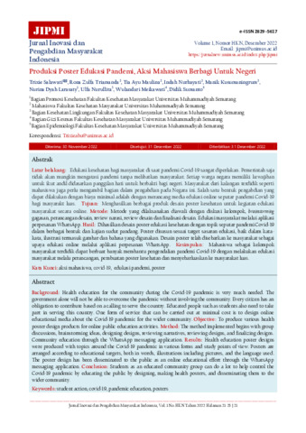 Trixie, Salawati and Rona, Zulfa Triamanda and Tia, Ayu Maulina and Indah, Nurhayati and Manik, Kusumaningrum and Nurina, Dyah Larasaty and Ulfa, Nurullita and Wulandari, Meikawati and Didik, Sumanto (2022) Produksi poster edukasi pandemi, aksi mahasiswa berbagi untuk negeri. Jurnal Inovasi dan Pengabdian Masyarakat Indonesia, 1 (HKN): 6. pp. 21-25. ISSN 2829-5617