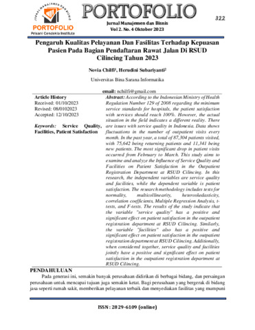 Novia, Chilfi and Herudini, Subariyanti (2023) Pengaruh kualitas pelayanan dan fasilitas terhadap kepuasan pasien pada bagian pendaftaran rawat jalan Di RSUD Cilincing tahun 2023. Jurnal Portofolio: Jurnal Manajemen dan Bisnis, 2 (4): 3. pp. 322-332. ISSN 2829-6109