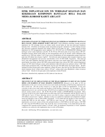 Sinarep, Sinarep and Sujitno, Tjipto and Mudjidjana, Mudjidjana (2007) EFEK IMPLANTASI ION TiN TERHADAP KEAUSAN DAN KEKERASAN KOMPONEN BANTALAN BOLA DALAM MEDIA KOROSIF KABUT AIR LAUT. In: Pertemuan dan Presentasi Ilmiah Teknologi Akselerator dan Aplikasinya, 9 November 2007, Yogyakarta.