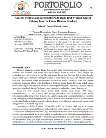 Zulaeha, Zulaeha and Danang, Choirul Umam (2023) Analisis pembiayaan konsumtif pada Bank BNI Syariah Kantor Cabang Jakarta Timur di masa pandemi. Jurnal Portofolio: Jurnal Manajemen dan Bisnis, 2 (4): 6. pp. 357-364. ISSN 2829-6109