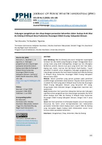 Seri, Warzukni and Sri, Raudhati and Agustina, Agustina (2023) Hubungan pengetahuan dan sikap dengan perawatan kehamilan dalam budaya Aceh Mee Bu Gateng di Wilayah Kerja Puskesmas Peusangan Siblah Krueng Kabupaten Bireuen. Journal of Public Health Innovation (JPHI), 3 (2): 1. pp. 101-106. ISSN 2775-1155