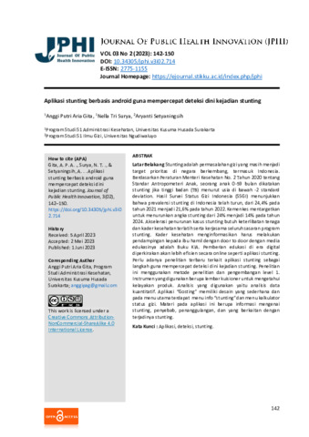 Anggi, Putri Aria Gita and Nella, Tri Surya and Aryanti, Setyaningsih (2023) Aplikasi stunting berbasis android guna mempercepat deteksi dini kejadian stunting. Journal of Public Health Innovation (JPHI), 3 (2): 6. pp. 142-150. ISSN 2775-1155